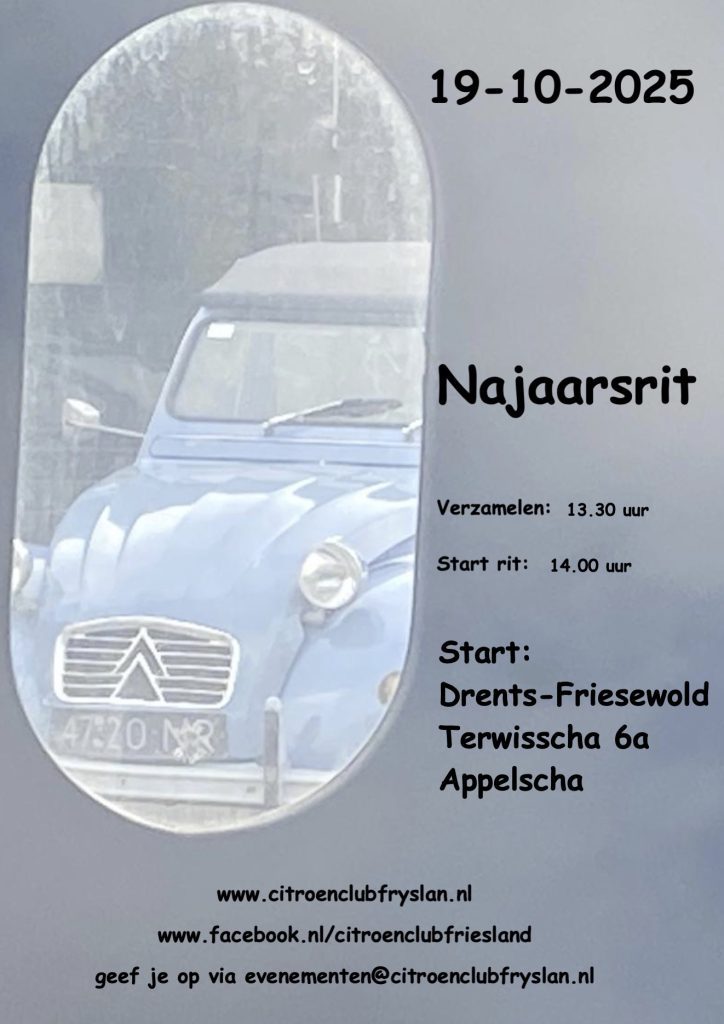 Najaarsrit. Verzamelen tussen 13.30 en 14.00 uur. Start: Buitencentrum Drents-Friesewold, Terwisscha 6a, Appelscha. Vertrek: 14.00 uur. Onderweg koffie met lekkers. Aan het eind van de rit de mogelijkheid om koffie te drinken en een hapje te eten.